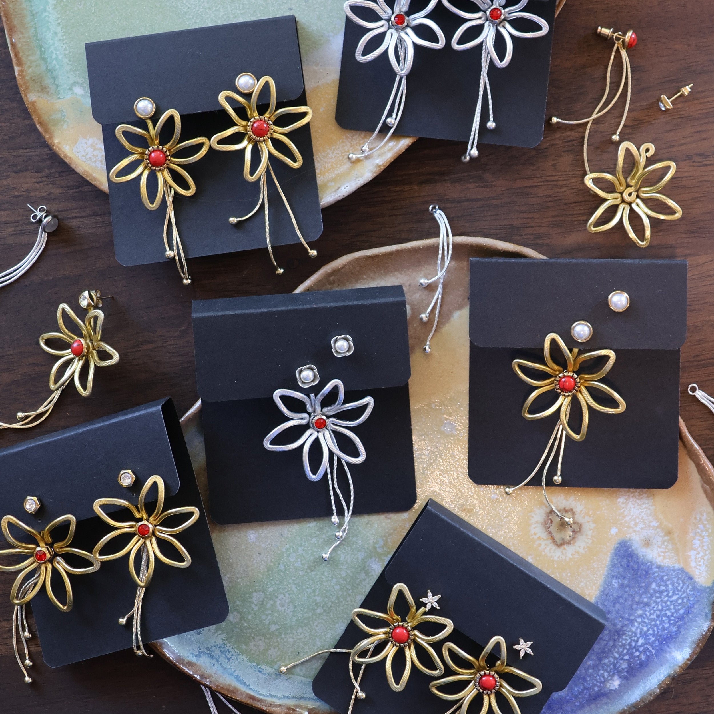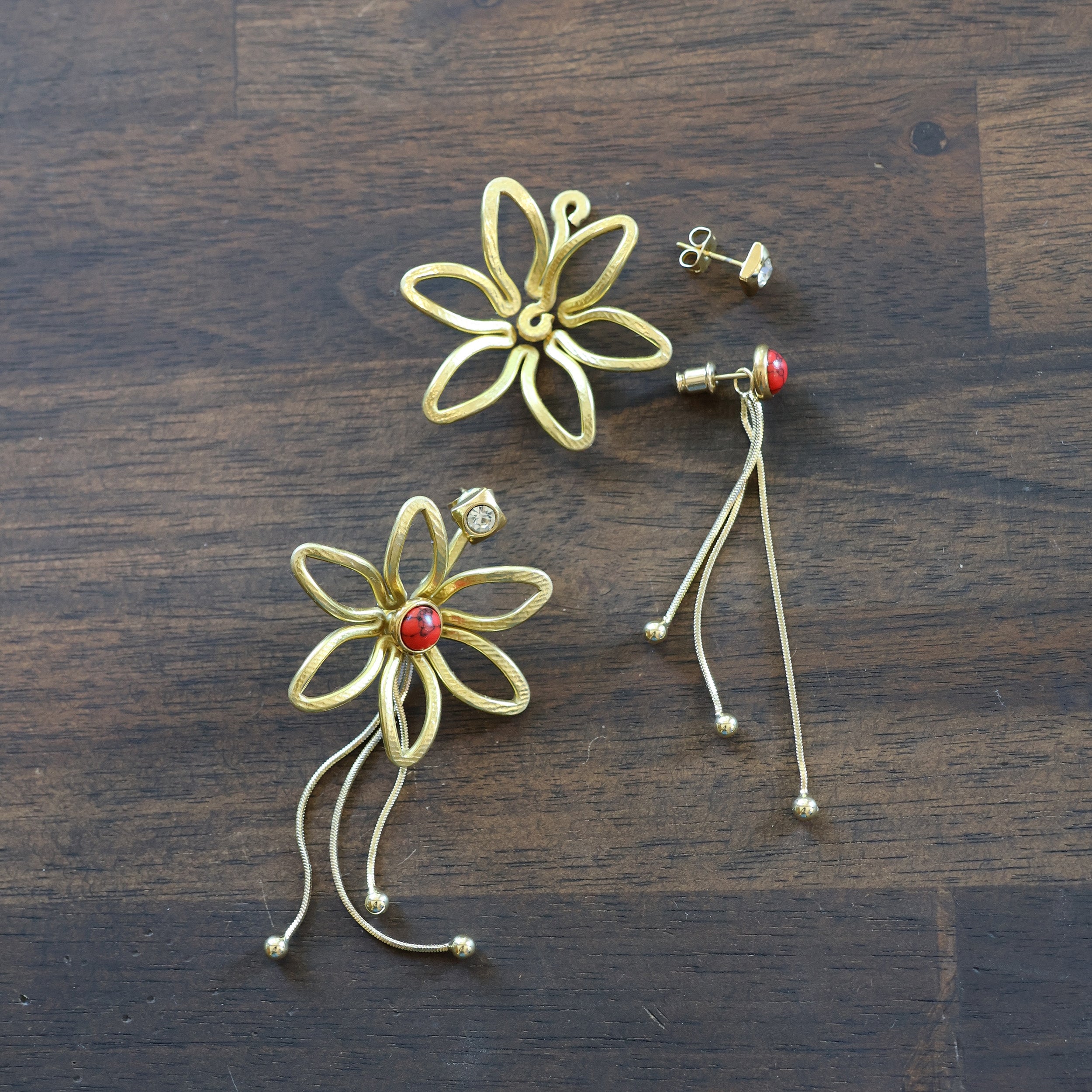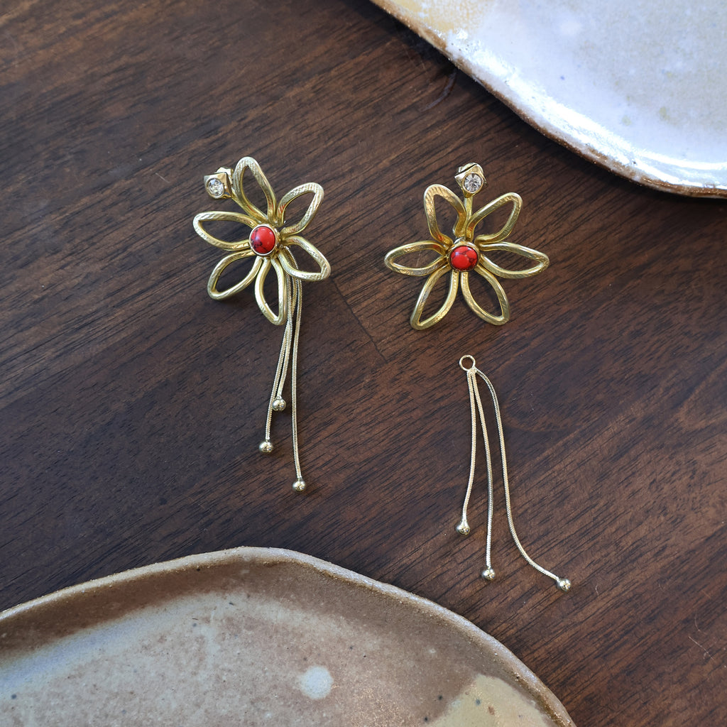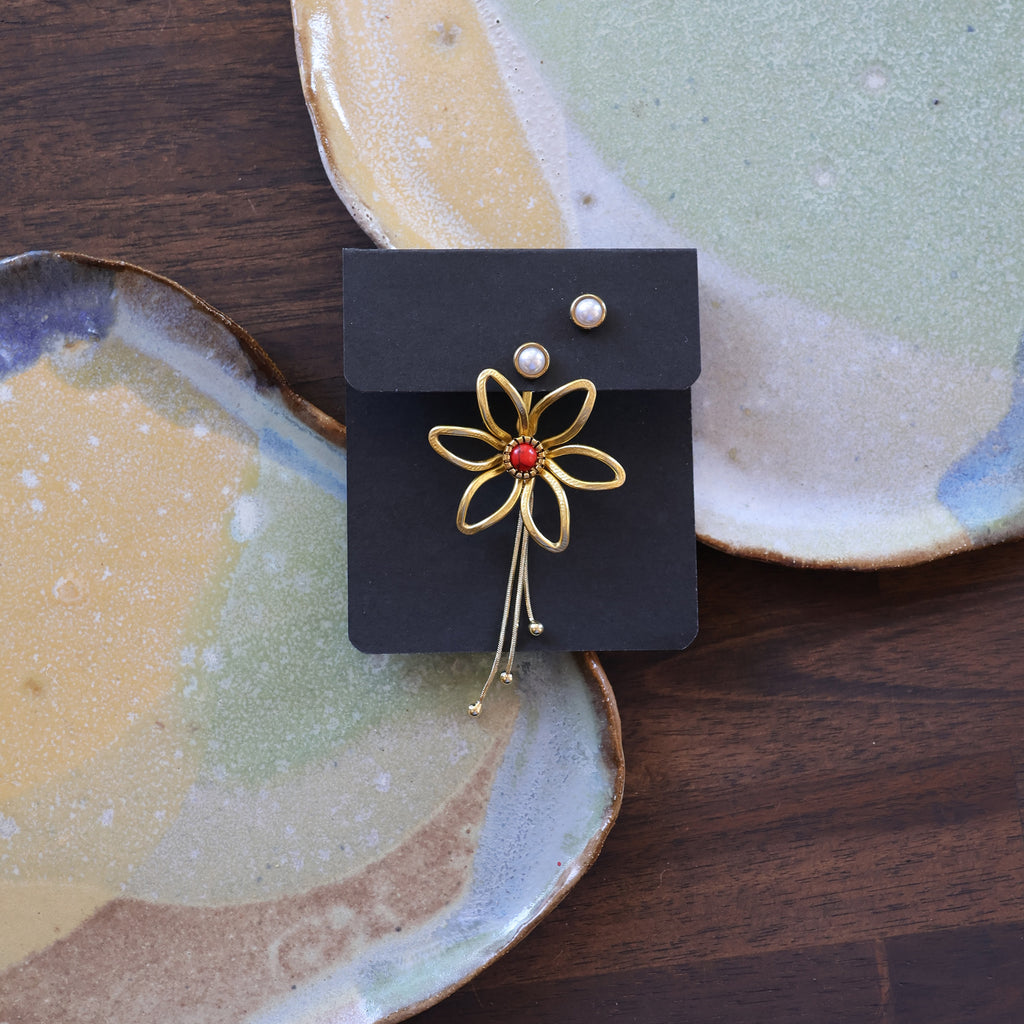 Just One Earring option: One handmade earring jacket, 3 studs (1 pair of matching studs and 1 extra for the flower center) and a single removable backing chain.