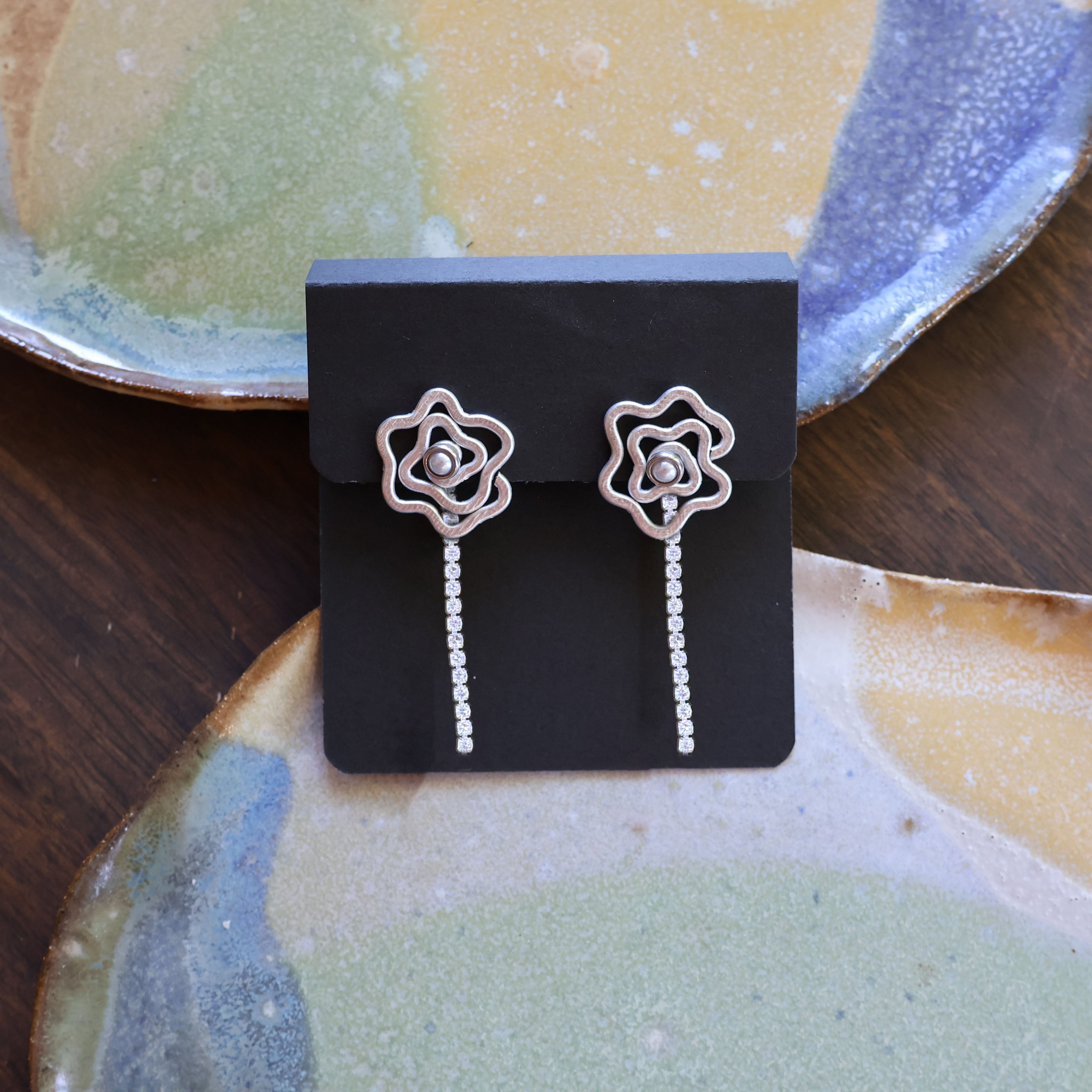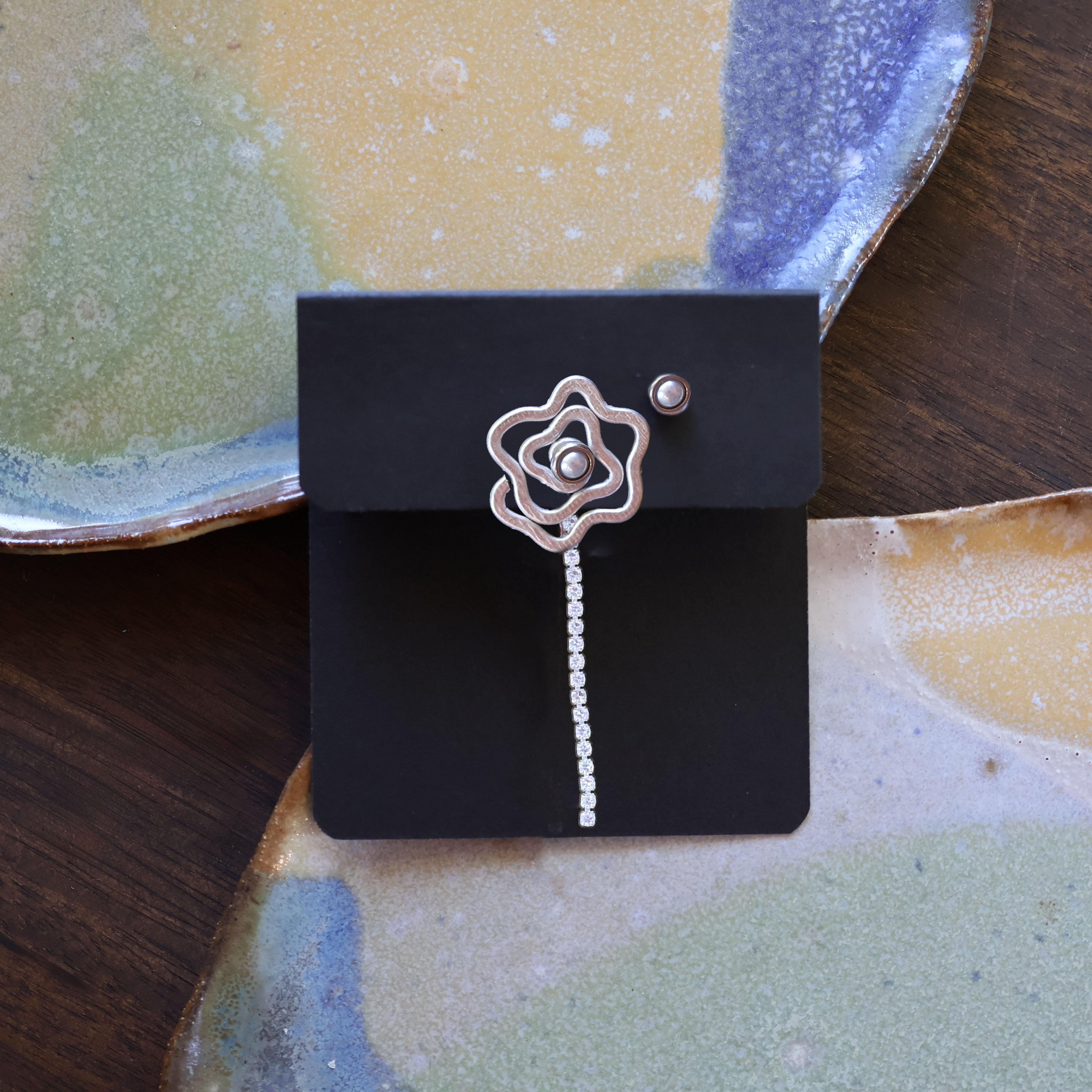 The Abstract Rose is a hand-formed statement earring with a soft rose shape. It sits beautifully in front of the ear and comes with cubic zirconia backing chains that can be worn with or removed for a simpler look.